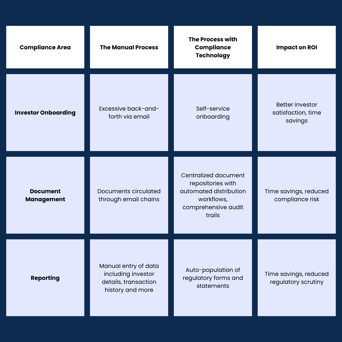 Compliance costs are rising for firms in Canada’s private capital markets, yet many of the most time consuming tasks are still handled manually. Modern compliance technology changes that. This article breaks down the three biggest ROI opportunities that compliance technology creates for private market firms and explains why automation is now a strategic advantage.