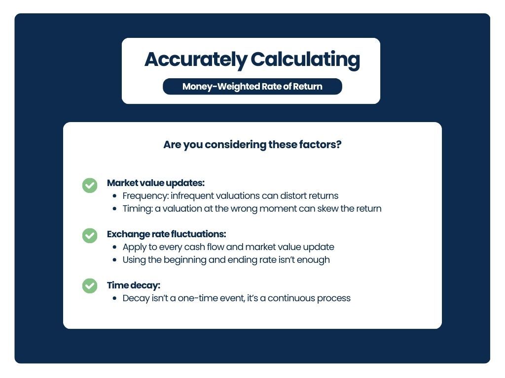 Accurately calculating MWRR, especially for private capital firms, is more complex than it seems. Factors like exchange rates, market value updates, and time decay must be applied continuously, and not just as a single adjustment. These changes must be applied at the beginning, end, and throughout the life of a transaction.
