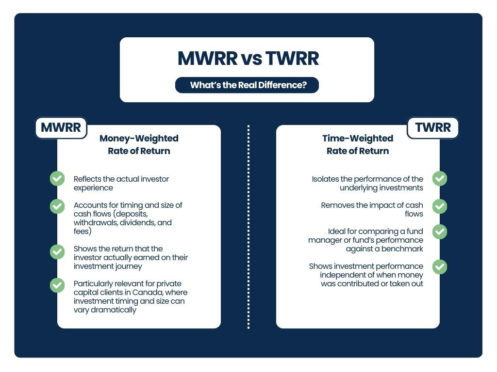 MWRR reflects the actual investor experience. It accounts for the timing and size of cash flows such as deposits, withdrawals, dividends, and fees, and shows the return that the investor actually earned on their specific investment journey. Essentially, MWRR is the Internal Rate of Return (IRR) for the portfolio. This calculation is particularly relevant for private capital clients in Canada, where investment timing and size can vary dramatically.